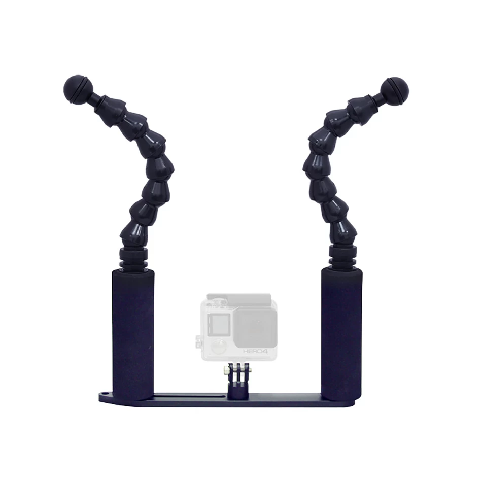 Platine Bigblue pour caméra embarquée de type Gopro. Idéal pour filmer avec 2 phares, grâce aux 2 bras flexibles l’éclairage peut être orienté selon l’angle shouaité.