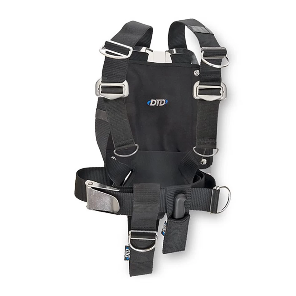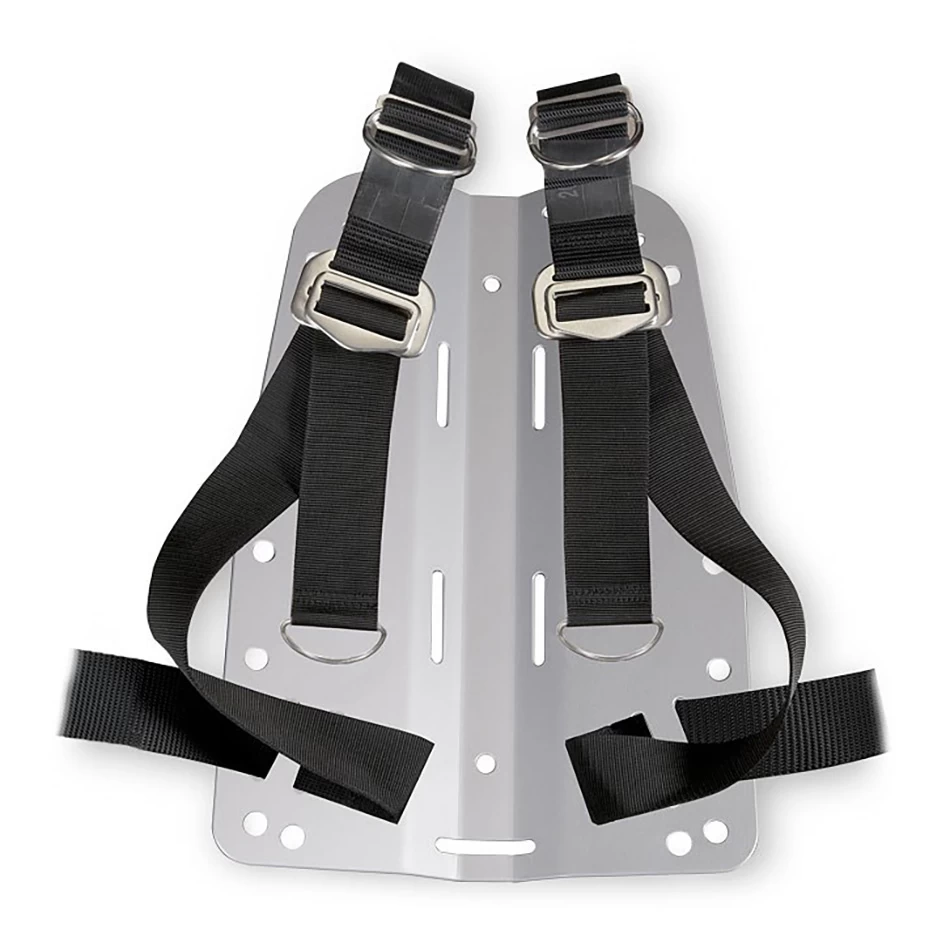 Harnais de plongée DTD avec plaque arrière en acier inoxydable, épaisseur 3 mm, en acier inoxydable résistant à l’eau salée avec bords biseautés sur une fraise NC, polie manuellement pour un aplatissement parfait des bords tranchants.