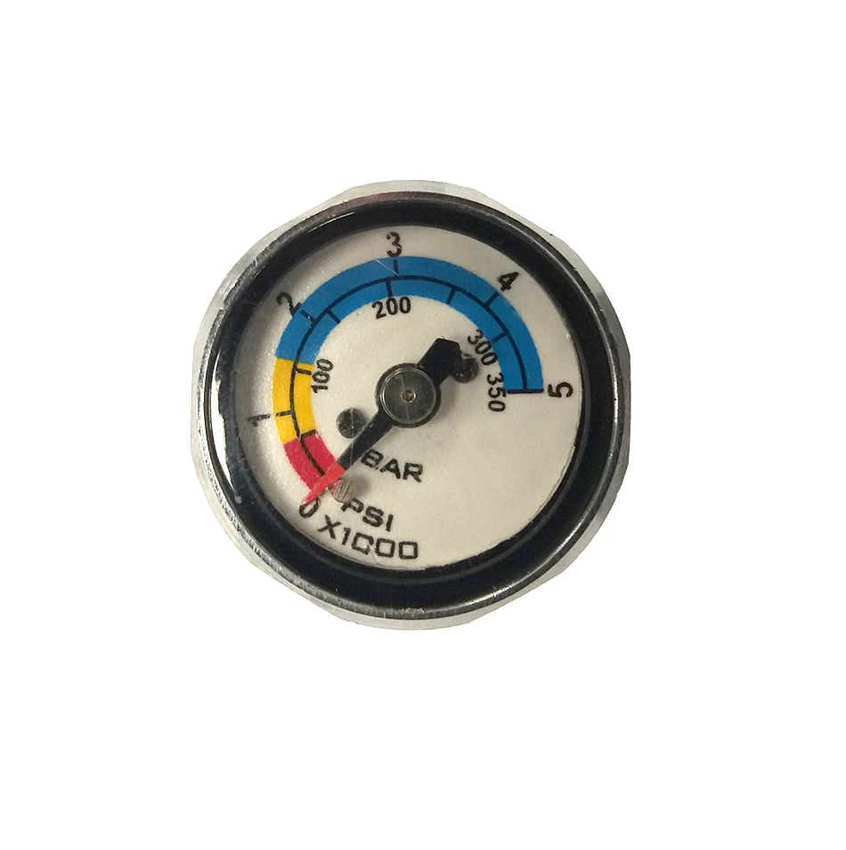 Mini manomètre, ou manomètre bouton, se fixant sur une sortie HP, fournie avec un nipple pour montage sur flexible.